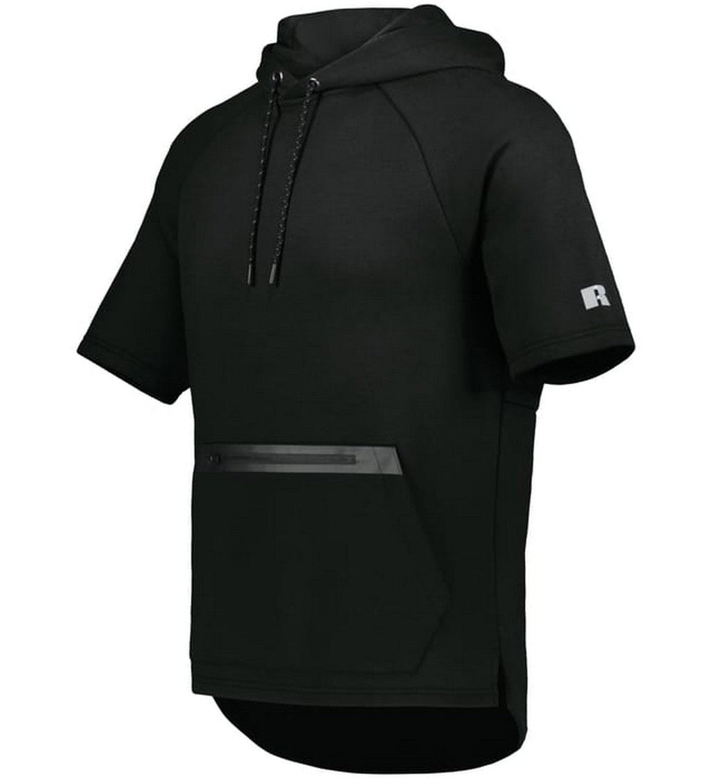 Introducing the Legend Short Sleeve Tech Fleece Hoodie by Russell. Created from a blend of 66% cotton and 34% polyester tech fleece, it perfectly balances warmth and breathability. Designed for practicality without sacrificing style, this tech fleece features a 3-piece jersey lined hood with a drawcord for personalized comfort. The raglan sleeves ensure a comfortable fit that allows easy movement. The front boasts a zippered valuables pocket, adorned with weld tape accents, while the front pouch pocket adds functionality. Experience comfort and convenience effortlessly with the Legend Short Sleeve Tech Fleece Hoodie.